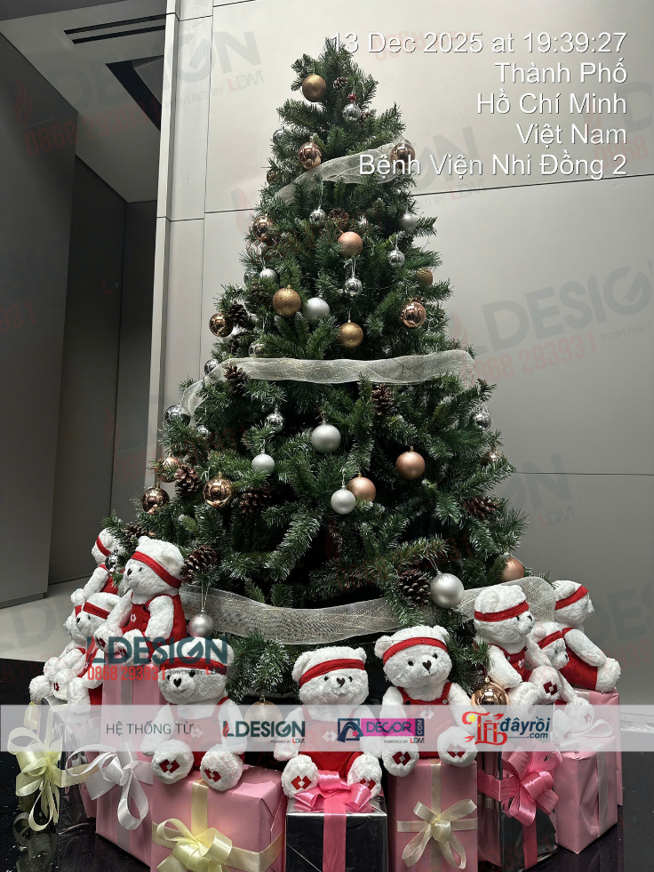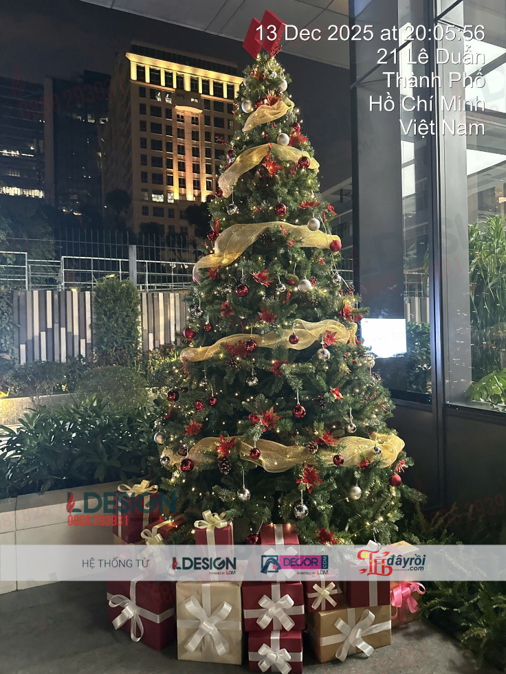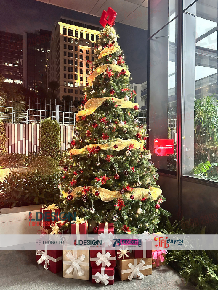 Sử dụng cây thông chất lượng cao với tán dày, dáng chuẩn và khung chắc chắn. Phụ kiện trang trí bao gồm bóng Noel, nơ, dây trang trí, ngôi sao và hệ thống đèn LED an toàn, phù hợp không gian giao dịch đông người.
