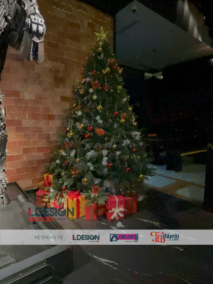 Cây thông Noel được lựa chọn kích thước phù hợp với không gian, phối màu đồng nhất với nội thất, tạo điểm nhấn nổi bật nhưng không gây rối mắt. Các chi tiết trang trí như châu, nơ, phụ kiện cao cấp giúp tổng thể trở nên hài hòa và đẳng cấp.